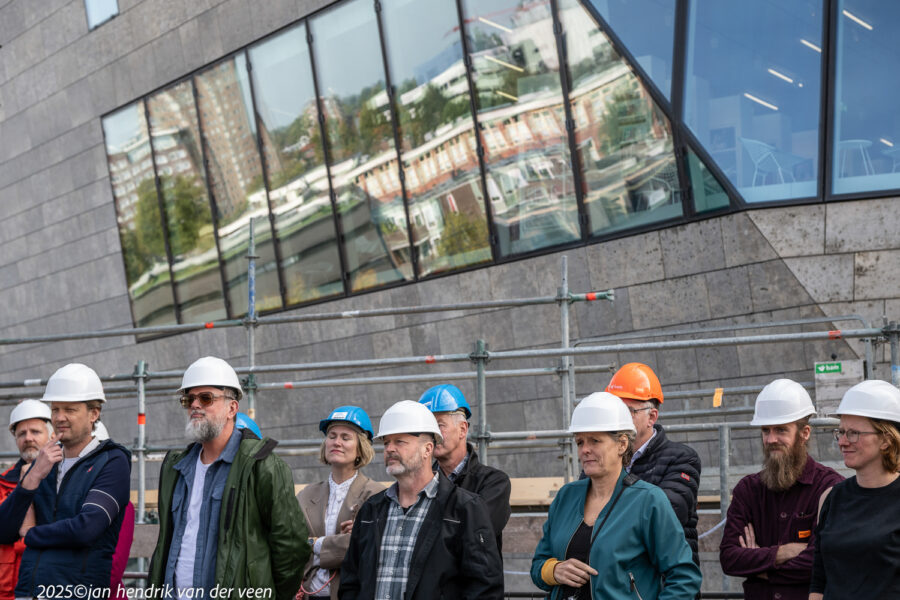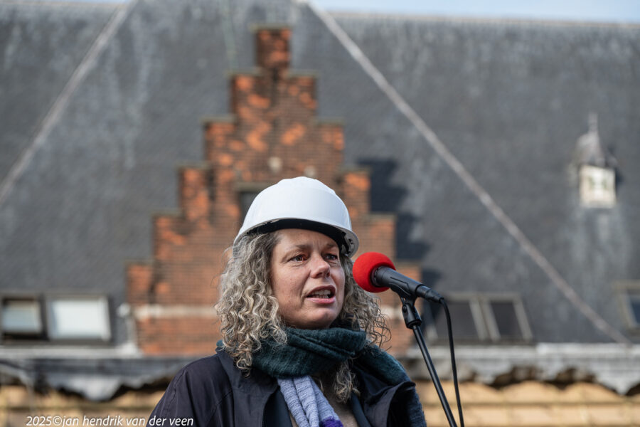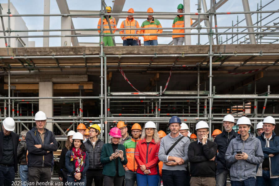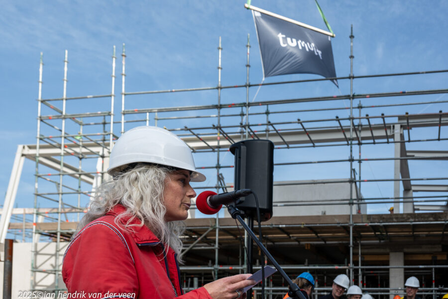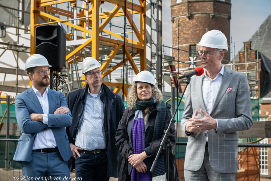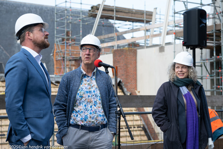 Wethouders Van Niejenhuis en De Wrede spraken bij de viering van het hoogste punt en de bekendmaking van de naam van het kunstencentrum aan de Sint Jansstraat